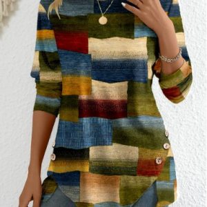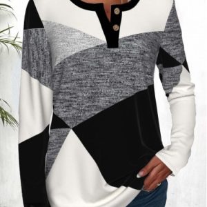Multi Color Button Geometric Print Long Sleeve T Shirt