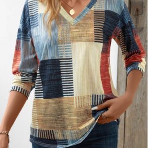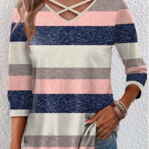 Navy Asymmetry Striped Long Sleeve Asymmetrical Neck Blouse