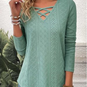 Green Criss Cross Long Sleeve V Neck T Shirt