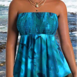 Peacock Blue Smocked Floral Print Sleeveless Bandeau Tank Top