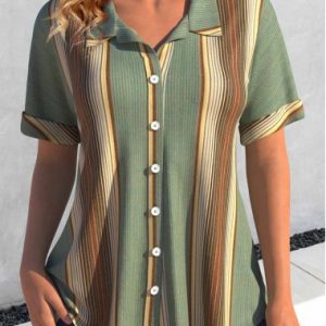 White Button Striped Short Sleeve Shirt Collar Blouse