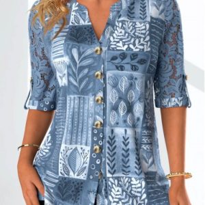 Light Blue Patchwork Floral Print Short Sleeve Blouse