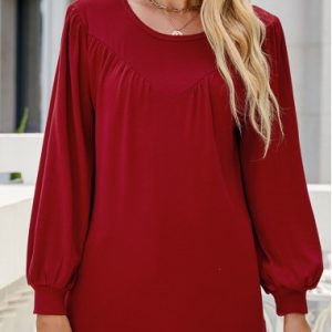 Wine Red Zipper Short Sleeve Round Neck Blouse