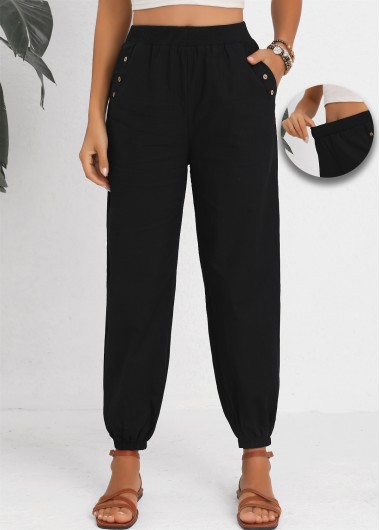 Black Button Jogger Elastic Waist High Waisted Pants