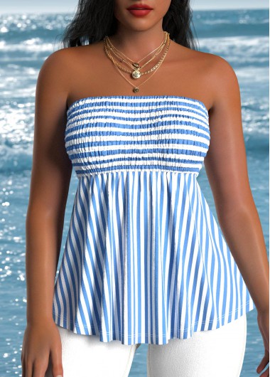 Blue Smocked Striped Sleeveless Bandeau Tank Top
