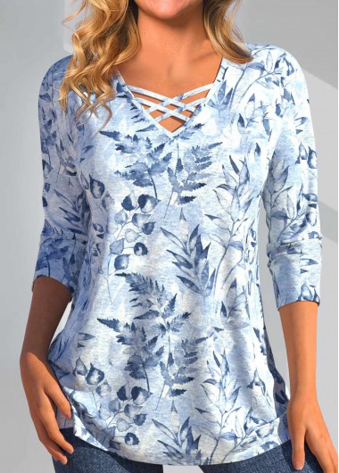 Dusty Blue Criss Cross Leaf Print T Shirt