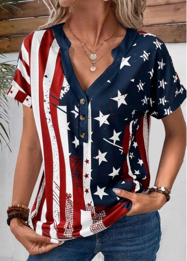 Multi Color Button American Flag Print T Shirt